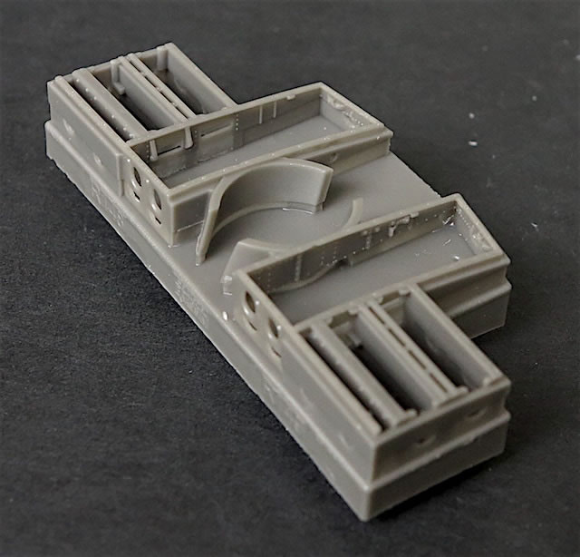 The two largest resin parts – the gun bay frameworks – are attached to a single casting block. At first glance, it looks like a solid, old school block of the kind that demanded time, effort and bad language to remove the parts. However Eduard has cleverly engineered the casting so the frameworks sit above the main block on thinner, perforated waste resin that should be comparatively easy to remove.