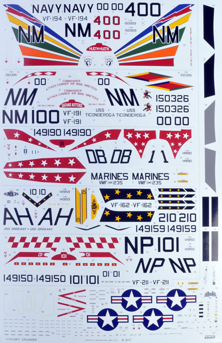 Markings are provided for five machines with bright markings. The basic colours for all five options are the standard Vietnam-era US Navy scheme of Light Gull Grey over White, but the nose and tail markings make for some very interesing subjects.