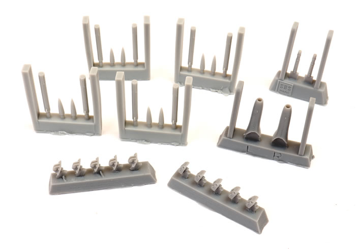 The four rocket rails are supplied in cast brass. Each rail mounts two rockets. They rails are supplied in one piece each and will require minimal cleanup.