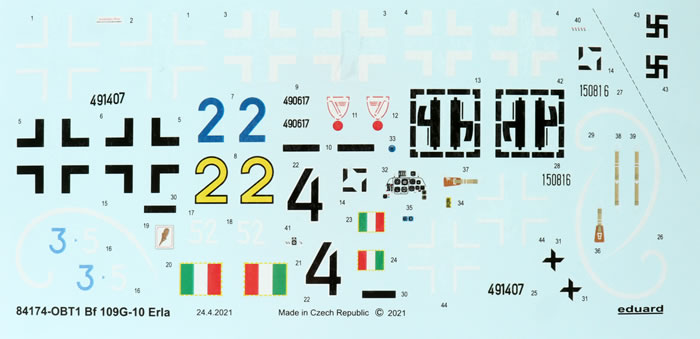 The decal sheets are perfectly printed in the Czech Republic. One sheet carries the national markings and unique numbers, chevrons, Gruppe markings, unit insignia and kill markings.