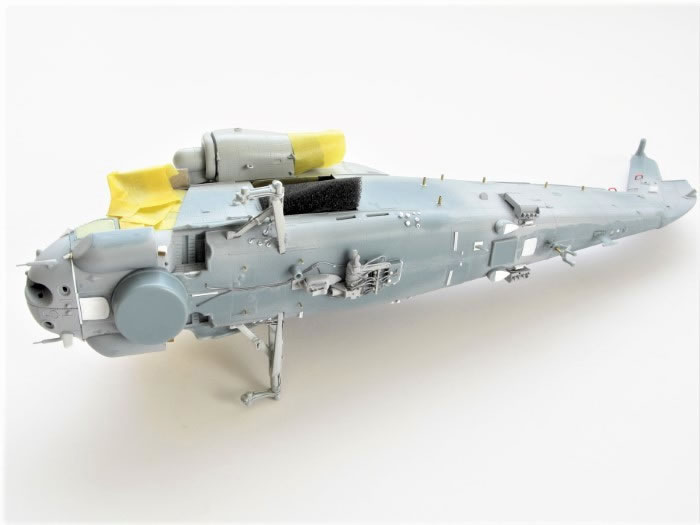 The kit contains markings for one of the five SH-2G(NZ) aircraft operated by New Zealand between 2001 and 2016. In order to make it more closely resemble a NZ machine, I added some extra details not included in the kit. This was mainly the radar equipment in the rear cabin, the bench seat, a beefed up cargo hook, winch, additions to the weapons pylon structure, HF aerial tubing on the port side (Albion Alloys Brass tubing was used for this) and a deck lock mechanism.