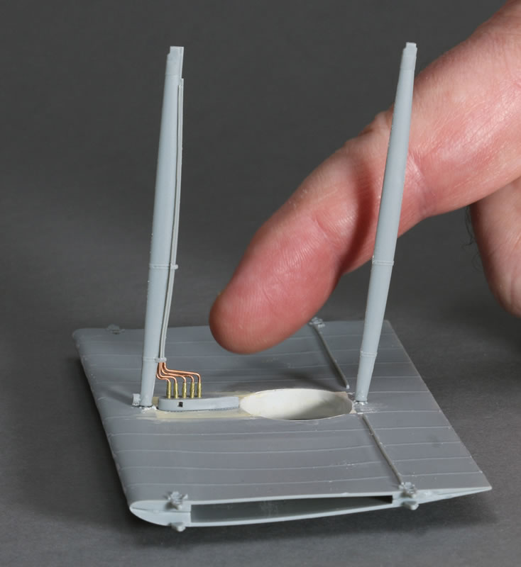 On the top section of wing the expanded 25 gallon petrol tank was re-created with various grades of plasticard and white epoxy filler, more copper wire to represent copper pipe, and an adapted spare piece of photo-etched brass from another kit to represent the little inspection hatch at the front.