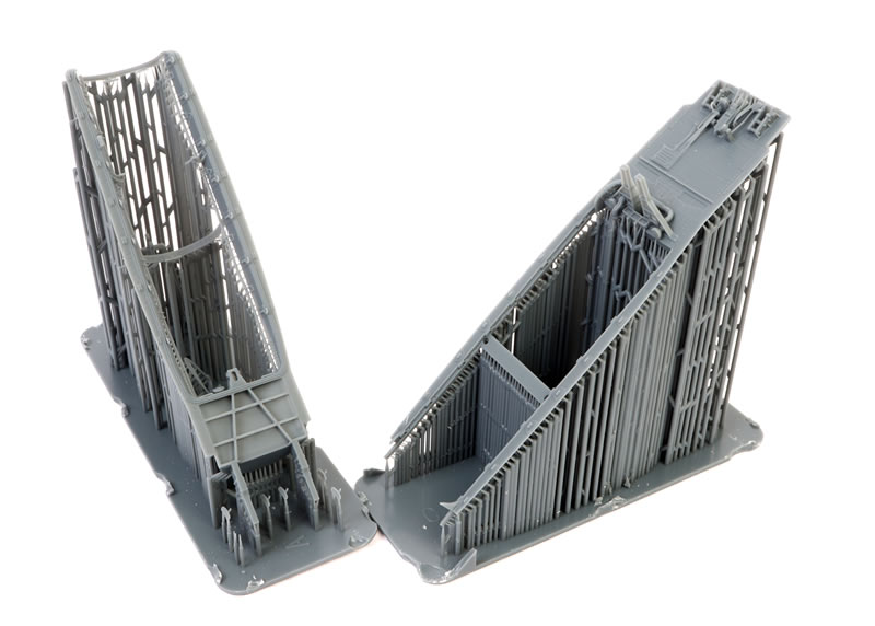 A total of eight 3 d printed resin parts are provided, all crisply rendered in grey 3D-printed resin. Each part is attached to a fine lattice of supports that taper to hair-thin contact points. There are dozens, if not hundreds, of these to remove. I recommend using a fresh hobby blade for the finer supports and a razor saw for the larger gates and protective frames.