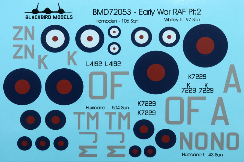This sheet from Blackbird Models covers markings for four RAF aircraft in the early part of WWII as follows:
