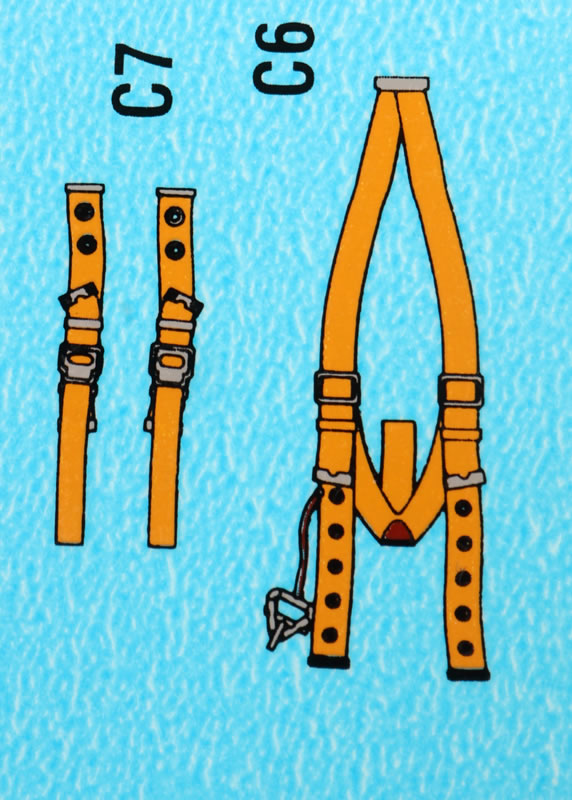The sheet also carries decals for the instrument panel, harness straps, sidewall details and stencil markings.