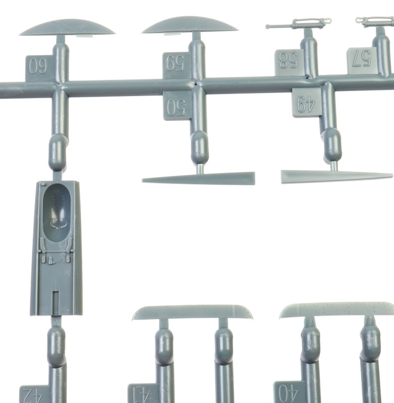 203 grey plastic parts (eight unused), 20 clear parts (four unused), a colour photo-etched fret, self-adhesive die-cut masks and markings for six aircraft.. |