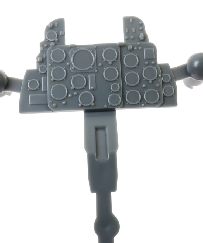 The plastic and photo-etched pilot’s seat will look good with its distinctive quilted backrest.