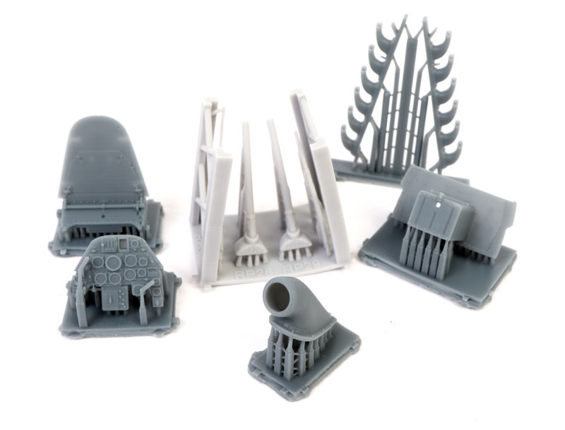 Resin parts include an combined cockpit floor, rear bulkhead, pilot’s seat with harness straps printed in place, rudder pedals and even toe straps.