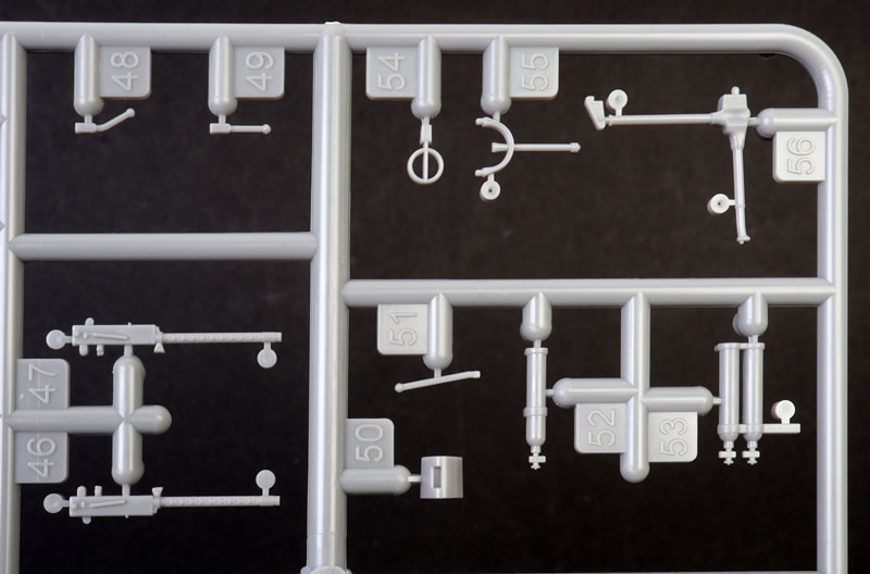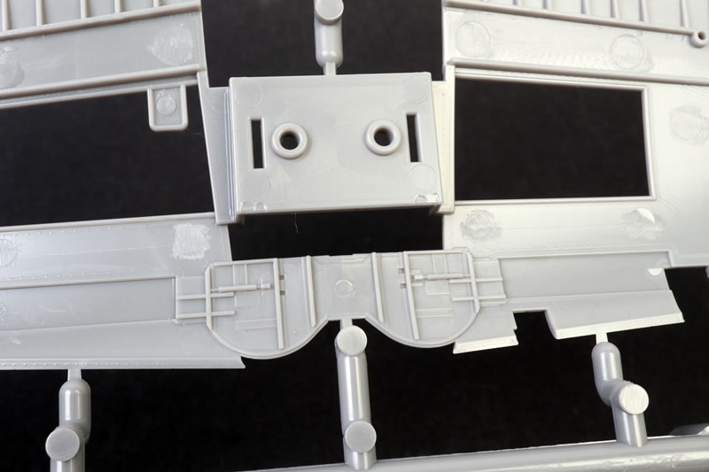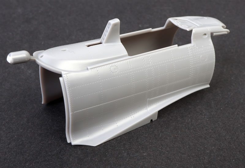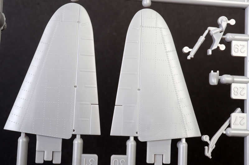 The wheel wells are packed with structural detail. Inserts are included for the upper and lower machine gun access hatches, while the flaps, ailerons, and rudder are all separate and may be posed to taste.
