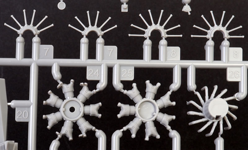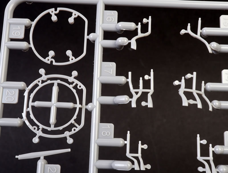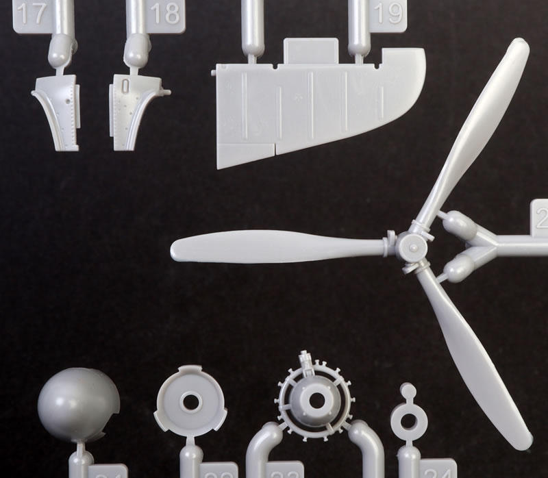 The engine is lavishly detailed, comprising 19 parts including cylinders, pushrods, crankcase, cowl flaps, and manifolds. The main undercarriage is simple but crisply moulded, and a drop tank is provided.