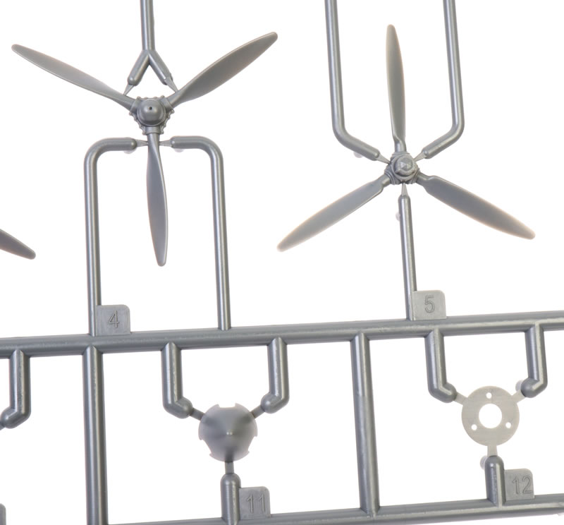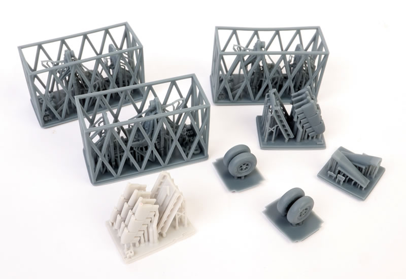 348 parts in grey coloured plastic; 46 parts in clear; two brass photo-etched frets; self-adhesive die-cut masking sheets; 3d printed resin parts (three cockpits, two pairs of main wheels, two pairs of exhaust stacks; seamless intake; mirrors (interior and exterior); two sets of self-adhesive die-cut masks; markings for ten aircraft.. |
