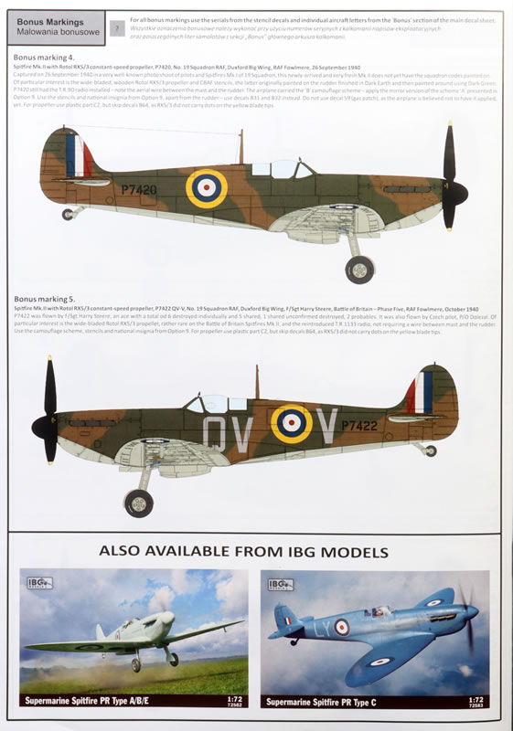 IBG's 1/72 scale Black Box Supermarine Spitfire Mk.I and Mk.II comprises 348 parts in grey coloured plastic, 46 parts in clear, two brass photo-etched frets; self-adhesive die-cut masking sheets; 3d printed resin parts (two cockpits, two pairs of main wheels, two pairs of exhaust stacks; mirrors (interior and exterior), two carburetor air intakes) and markings for ten aircraft.