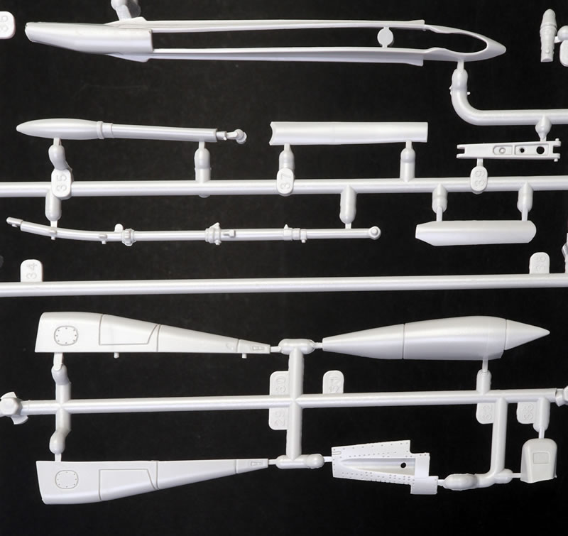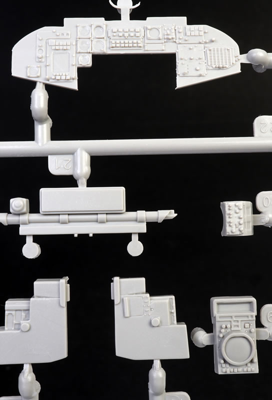 Clear parts are thin and free from distortion. The big two-piece canopy may be posed open or closed. Detonation cord is moulded onto the inside of the canopy - nice touch. A support strut is supplied for the open canopy option.