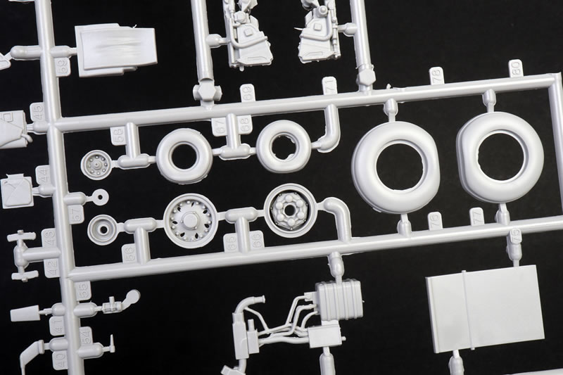 The wheel hubs and tyres are moulded separately. Italeri offers the option of flexible vinyl or solid plastic tyres. The plastic tyres are bulged and flattened. That’s the way I will be going.