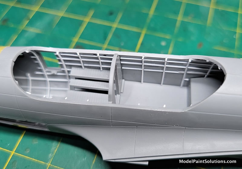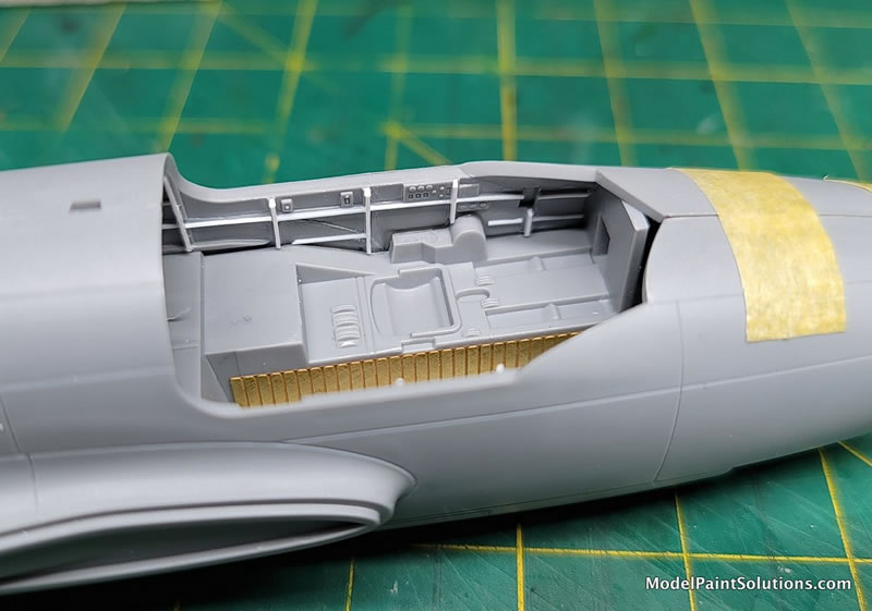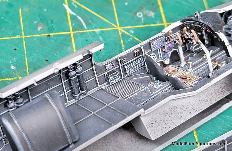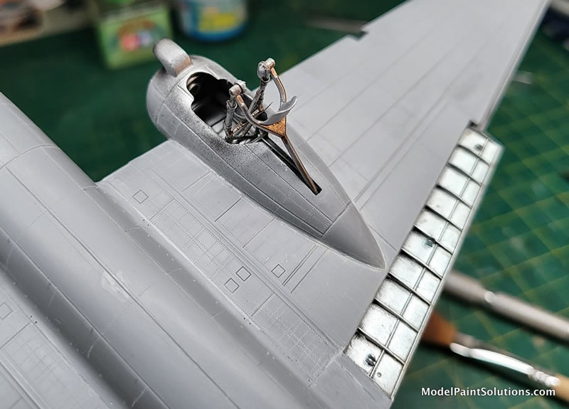 Once those areas were dried and masked, that was followed with an overall pre-shading/priming coat using Gunze’s Mr. Surfacer 1500/Black concentrating on panel & rivet lines as well as various crevices and recessed areas.