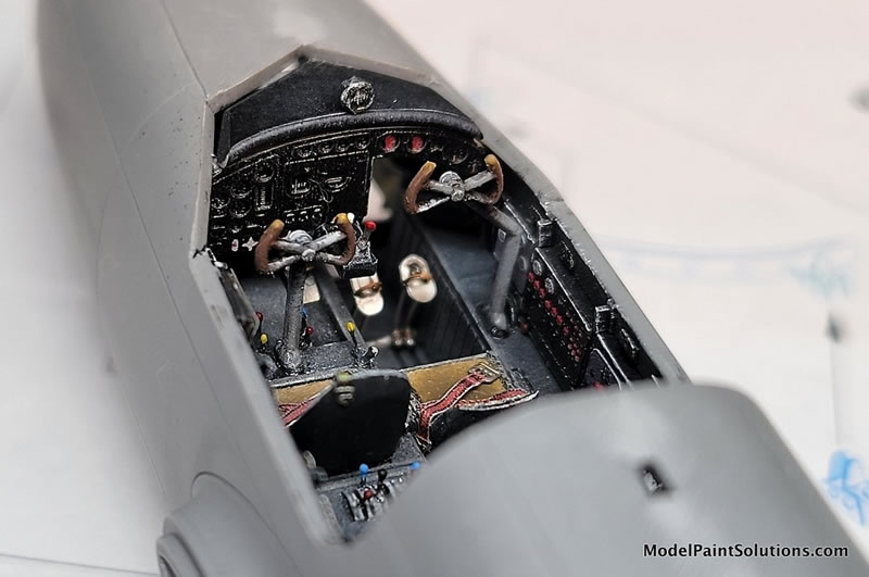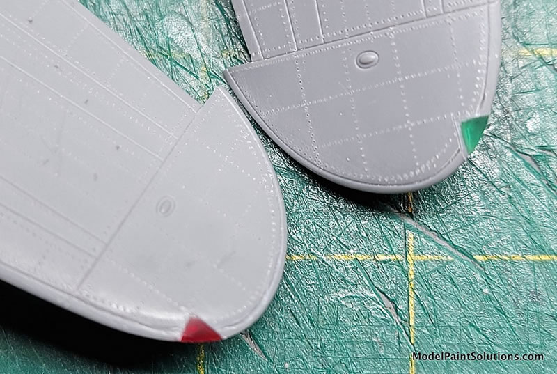 Wingtip lights were replaced with CMK’s red & green colored resin chunks cut from their colored lenses set, super glued into place, then carved and sanded to shape, polished to a gleam and masked using Microscale’s liquid mask.