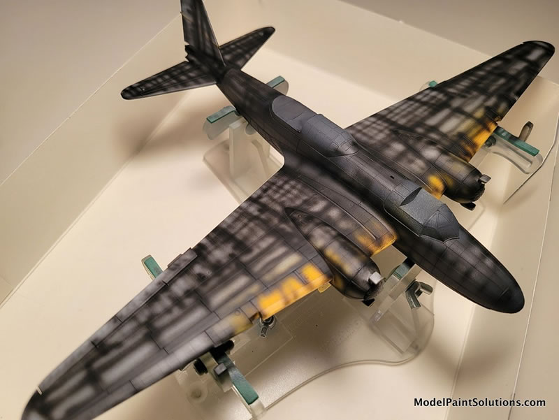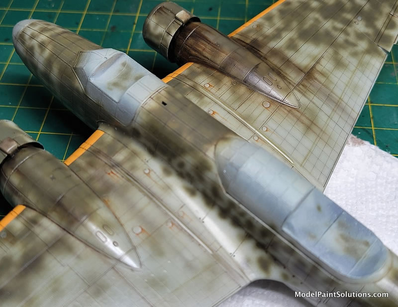 I followed up the camo painting by airbrushing on the exhaust stains with a black & red/brown Aqueous mix, as well as accentuating some panel lines and crevices here and there with a thin spray of that same color. I wanted to show an oil leaking engine too, so masked and sprayed the major portions of that staining on the starboard nacelle/wing.