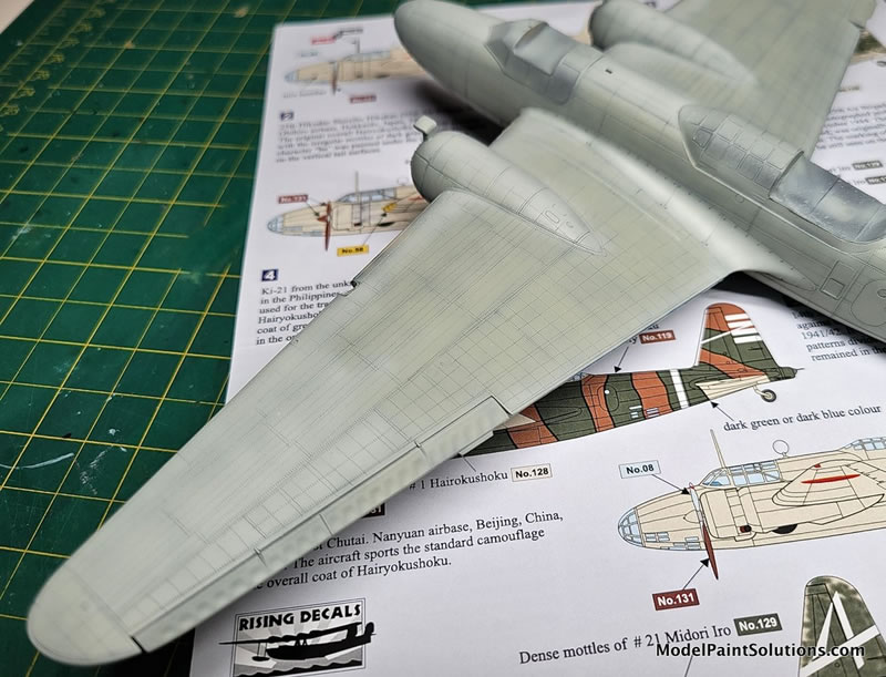 I wanted to do a mottled early Sally, but there really weren’t that many (ICM – PLEASE release a later type II ‘turreted’ version of the Ki-21!). But, I was able to find a few on ‘Rising Decals’ dedicated decal sheet No. RD72105 . The one I chose is of the 25th Air Brigade HQ Flight at Obihiro airfield, Hokkaido, Japan, February 1943 (just before this unit’s assignment to SE Asia). It’s not a complete mottle coverage which also appealed to me, obviously done at the airfield.