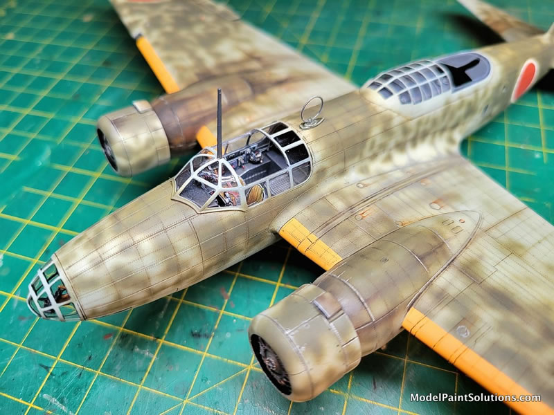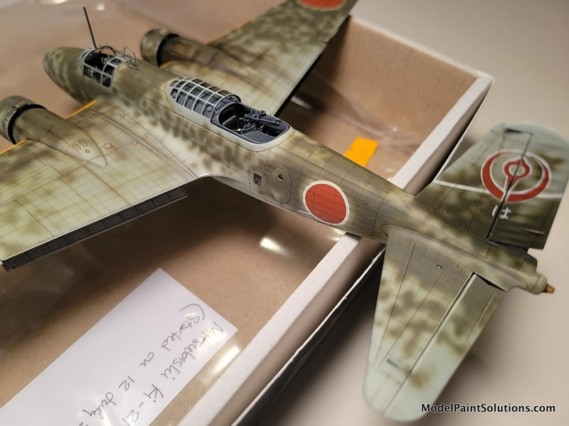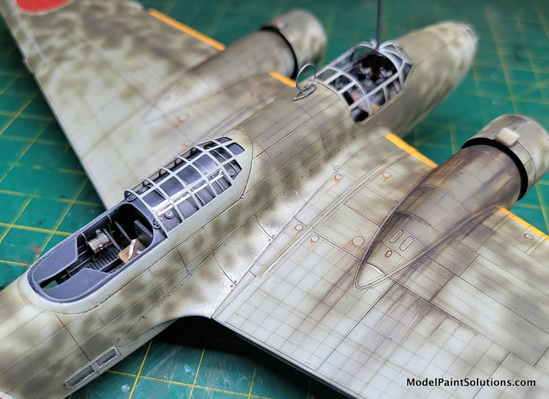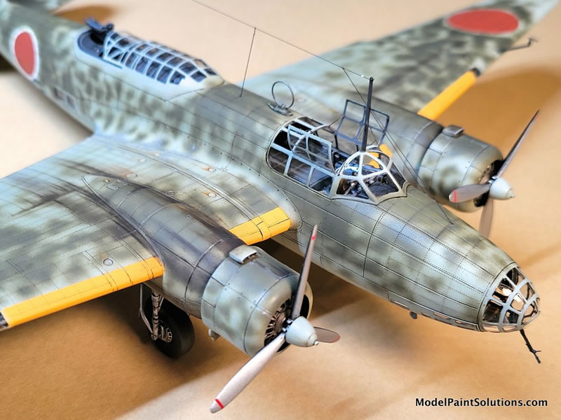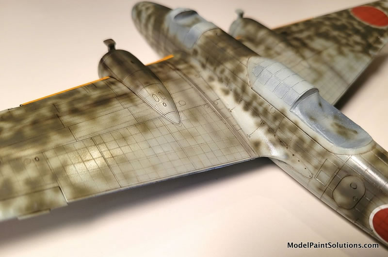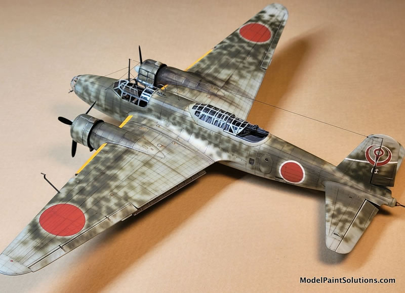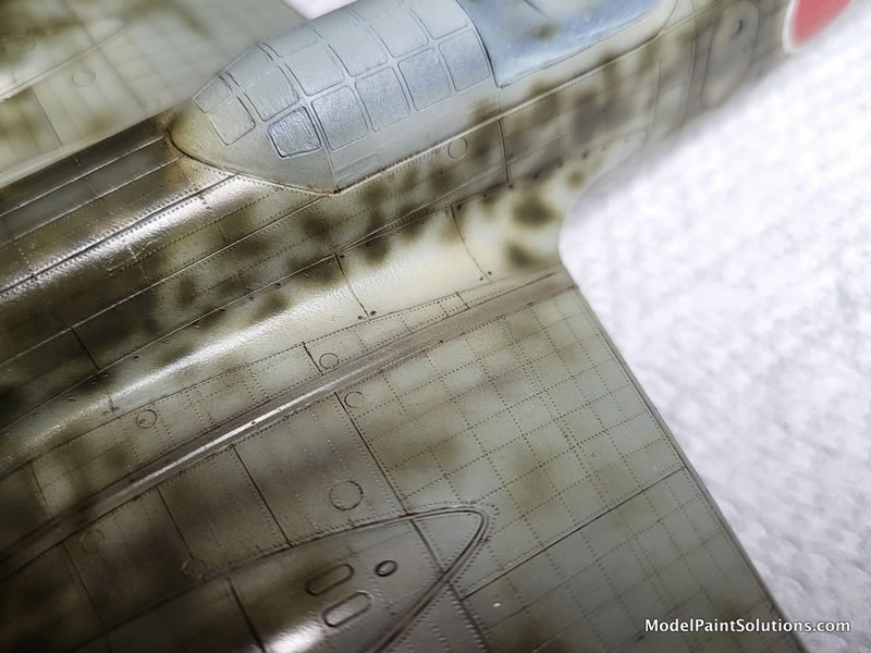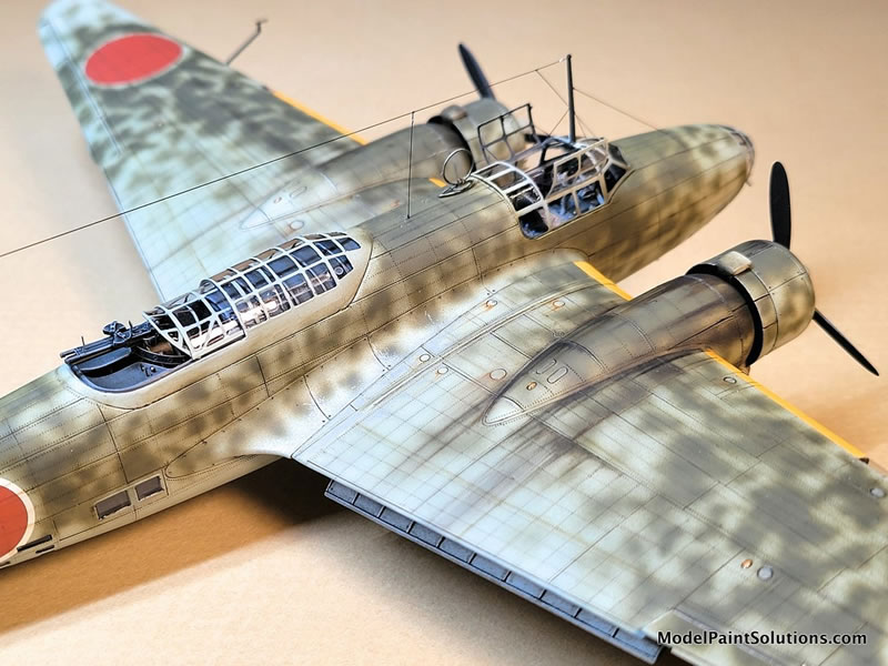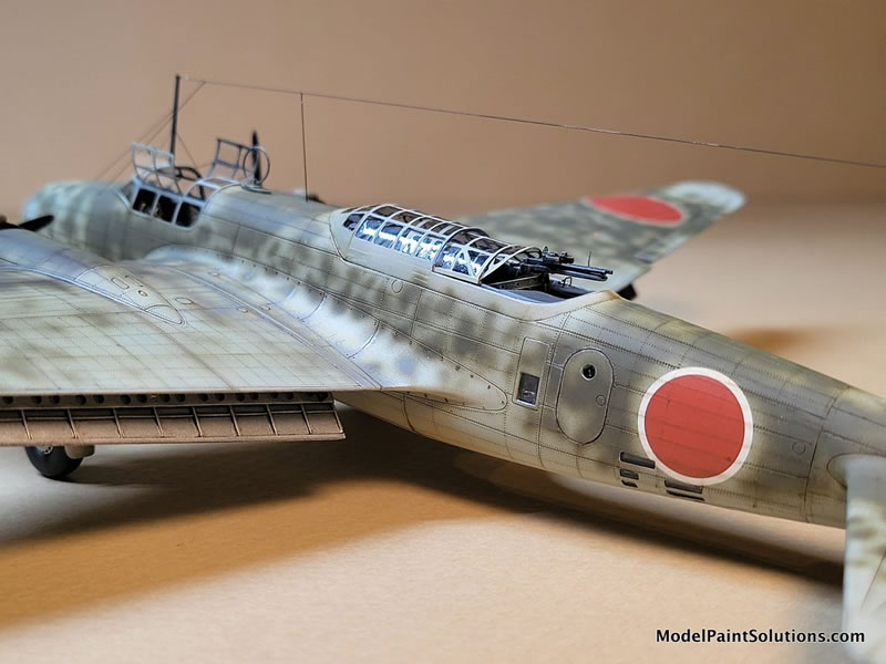 The camouflage colors started with three different shades of Imperial Japanese Army (IJA) Light Gray/Green overall color. Beginning with Vallejo Air’s version (because I had a lot of it, not because it’s a preferred brand or anything). I used the basic color, then another lightened with flat white and another darkened with a bit of Vallejo’s RLM 02 color. Note that Vallejo Air colors need to be used with their own brand of thinner, as they don’t play well with my favorite ‘go-to’ - Mr. Color Leveling Thinner (MCLT). Darker shades near the engine nacelles, wing roots, and bomb bay areas, lighter shades on all raised areas, and the basic color in-between. This gives the beginning finish an additional three dimensionality. Note that this color was airbrushed beginning ‘inside’ of each of the areas black outlined with the Mr. Surfacer Black, working outward while trying to preserve a hint of the underlying darker effect.