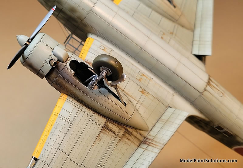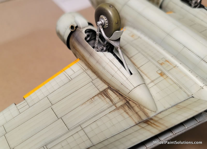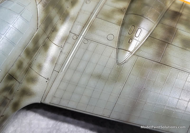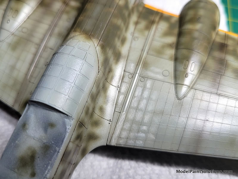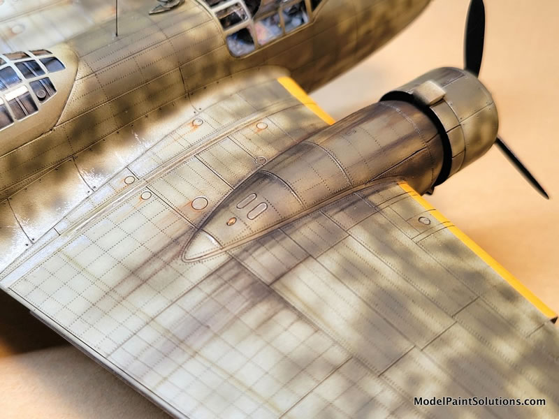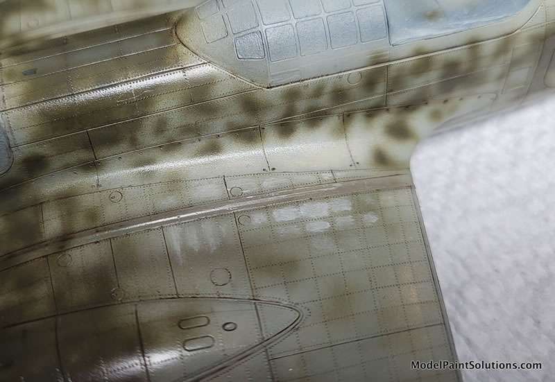 This was followed up in the major wing walk maintenance areas with some oil paint filters – brush on, let dry, wipe off leaving a tinted panel area here and there. Brown & ochre were used on the crew-dirtied areas. Then, some limited (because it’s a mottled camo scheme) manipulation of the highlights and shadows with oil paints. The oil paint is brushed on by panel for contrast, then gently brushed with a very soft brush which softens the effect leaving a subtle highlight, or shadow as you decide to add contrast and interest. These areas then need to be left to dry for a couple of days.