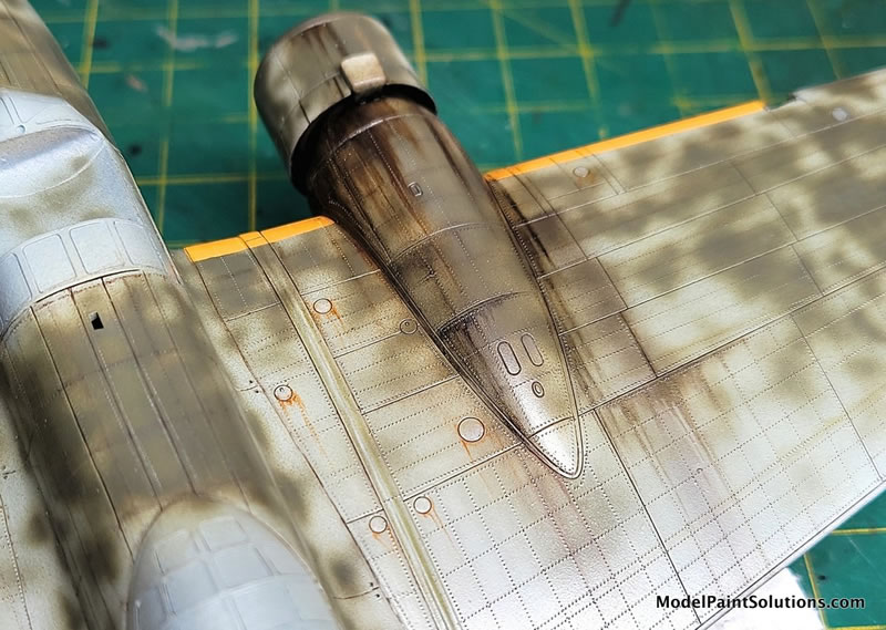 I started the weathering process with a brown/black oil paint pin wash brushed into the panel and rivet lines with a small brush (‘00’ size). Once dried, that was wiped off in the direction of flight using an old piece of fabric from a t-shirt. These can be de-emphasized, or attenuated afterward using the same mixture to achieve the desired look.
