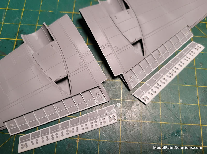 I wanted to create a bit more interest, so I cut away the flaps added scratch-built interiors with styrene strips and modeled them in the dropped position. Yeah, it’s uncommon to see flaps drooped on the ground, but I did find a couple of photos!