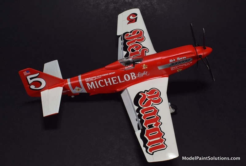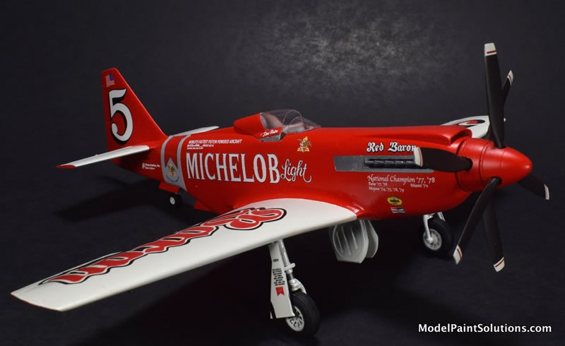 This is a 1:48 model of the Red Baron RB-51 Unlimited Reno Air Racer as it appeared in 1979. The Red Baron was a heavily modified P-51D Mustang that had a Rolls Royce Griffon engine installed driving a set of counter-rotating props.