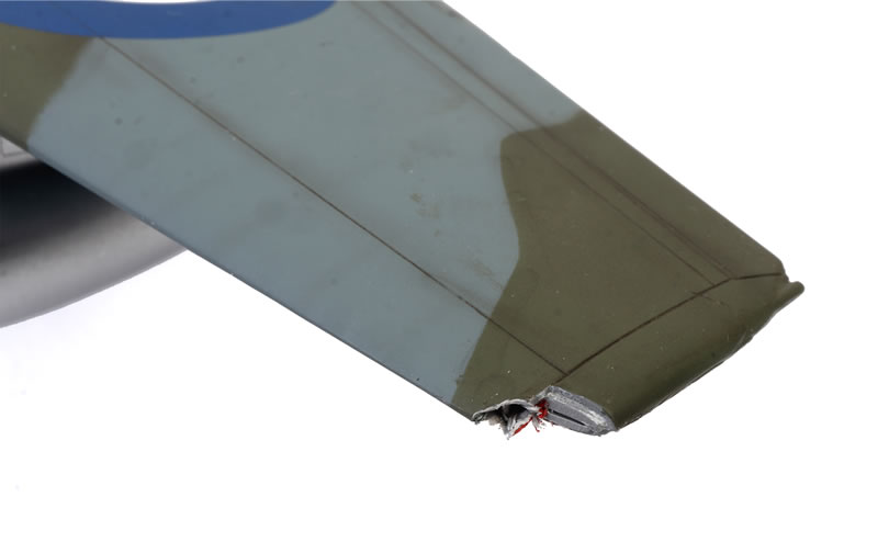 I was drilling out the wing tip pitot tube hole and basically exploded the port side front wing tip including the completed navigation light. I patched it up for the photos.
