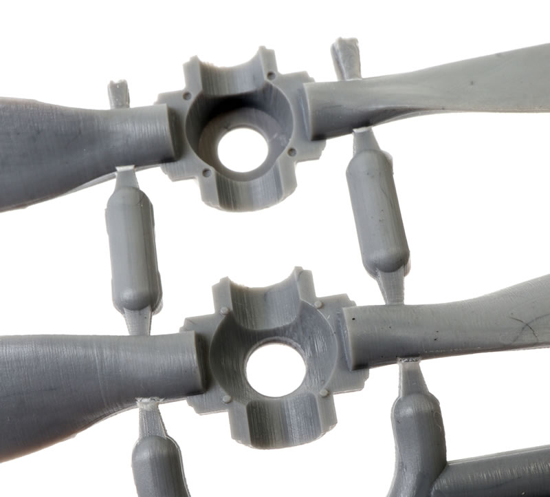 The Hornet’s port and starboard propellers rotated in opposite directions, and the propeller blades are moulded in pairs to ensure the correct pitch and rotation for each unit. Pay attention to the part numbers to ensure the propellers' proper orientation.
