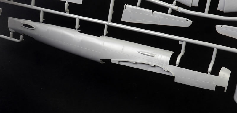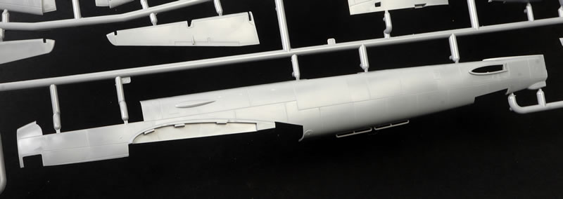 The fuselage is broken down into two full-length halves plus a lower mid-forward section with the inboard lower wings moulded in place.