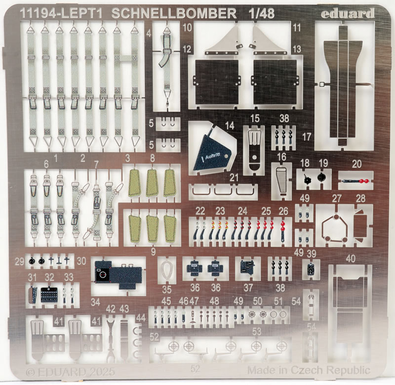 Eduard includes a colour photo-etched fret, one of their hallmarks. This mainly focuses on the cockpit with an instrument panel sandwich, switches, quadrants, boxes, harness straps for the entire crew and much more.