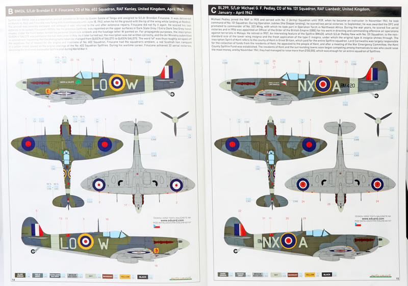 BM124, S/Ldr Brendan E. F. Finucane, CO of No. 602 Squadron, RAF Kenley, United Kingdom, April 1942. This one features a very interesting scheme that looks uncannily like Temperate Sea Scheme with colours similar to Extra Dark Sea Grey and Dark Slate Grey depicted on the upper surfaces.