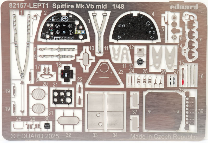 The photo-etched fret focuses on the cockpit with a detailed sandwich for the instrument panel, harness straps and more.