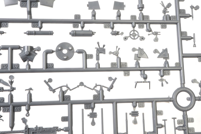 247 parts in grey plastic (including four not used); seven parts in clear plastic (including two not used); 3d printed instrument panel (three parts); one brass photo-etched fret with 133 parts; length of black vinyl tube; length of fine copper wire; self-adhesive canopy and wheel masks; decal sheets covering six subjects. |