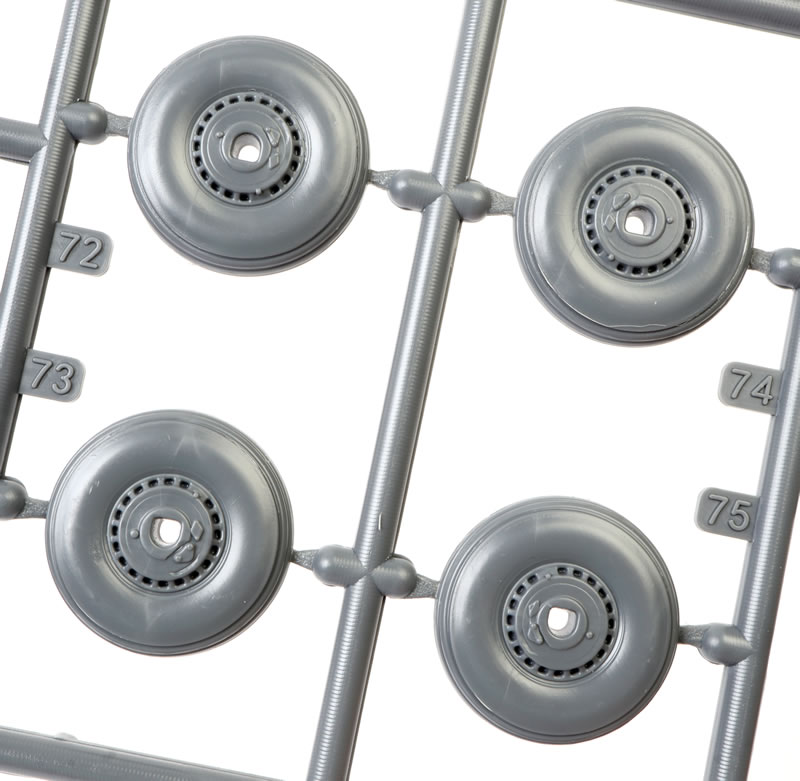 I am pleased to report that main wheels and the tail wheel are all-plastic. They are subtly flattened and bulged. No need for after-market replacements here.