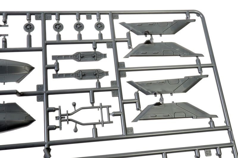 High level of detail; crisp and appropriate surface features including stealthy RAM areas; full engine included; photo-etched parts for seat harness straps; canopy may be posed open or closed; high quality decals for eight marking options. |