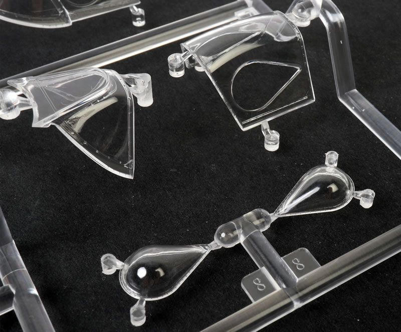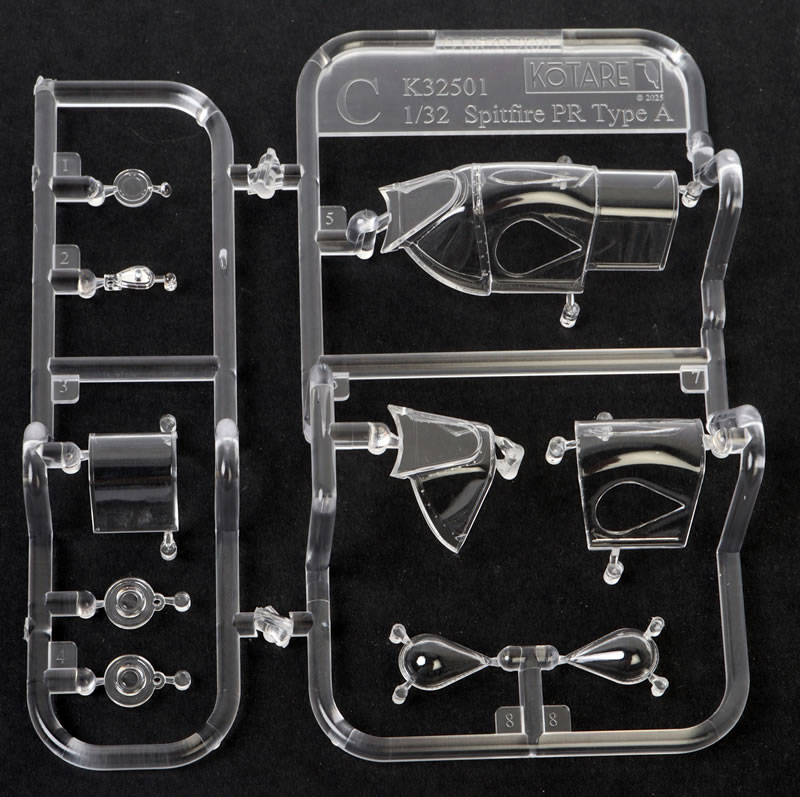 The clear sprue (Sprue C) adds a new canopy with its distinctive PR Type A tear-drop side blisters, along with two F24 camera lenses. The tear-drop blisters accurately capture the shape used exclusively on the PR Type A; later PR variants featured subtly different contours. The blisters are separate parts that attach to the sliding canopy section, which itself features cut-outs on each side. I recommend attaching these with a sparing application of white acrylic glue. Both an optional open canopy (three main pieces, or five including blisters) and a one-piece closed canopy are provided.