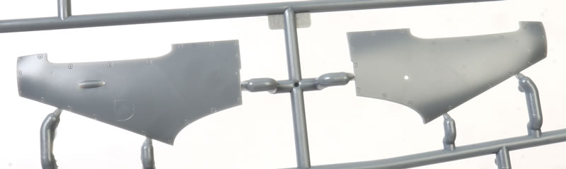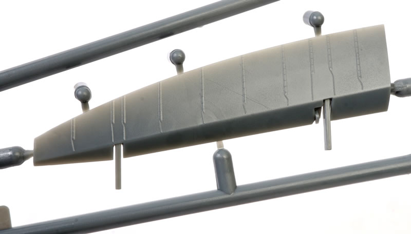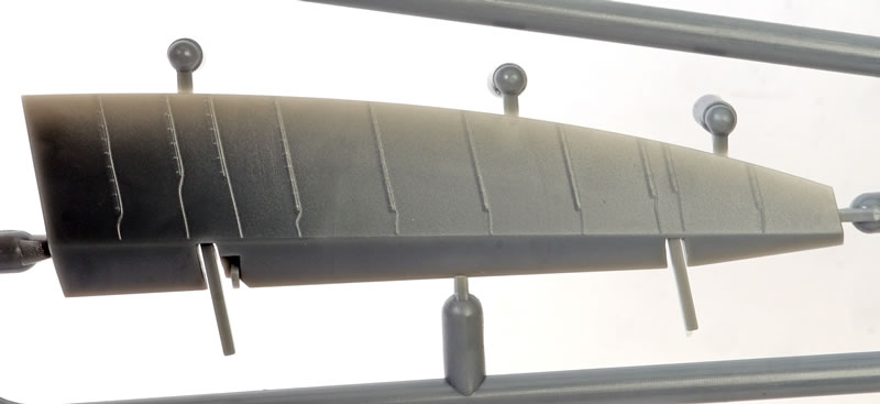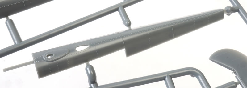 Wing fillets are separate parts, as are the ailerons, elevators and rudder. The rudder and elevators include locating tabs, but these may be easily removed if you wish to pose the control surfaces deflected.