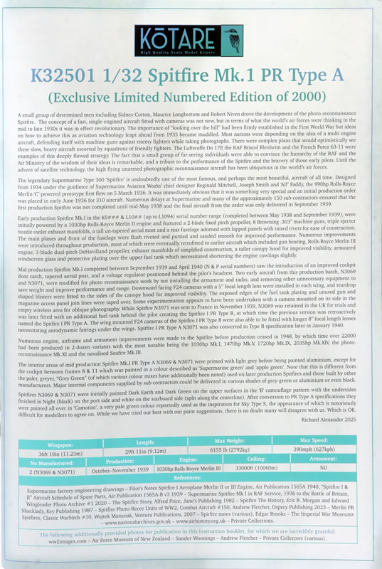 Kotare Models Kit No. K32501 - Spitfire Mk.I PR Type A |