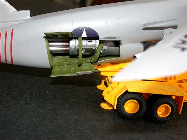 As HyperScale brethren may already know, we at Bondo Industries usually favor definitive operational colors, as opposed to garish (in this case, especially) test markings as Lindberg provided in the kit. The Snark at the USAF Museum is done in gray, and your correspondent prefers the subdued gray against the stark chrome yellow trailer.