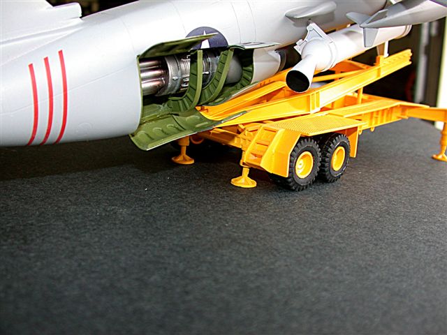 This is the ancient Lindberg, all right! Red plastic, boiler-sized rivets and raised panelling everywhere. Plus the same handy jet engine that accompanied so many of the firm’s releases of the 50s and 60s. But, when all’s said and done, dimensions seem close enough for government work, and there’s the neat launching trailer and mini-CAT towing vehicle that are part of the kit.