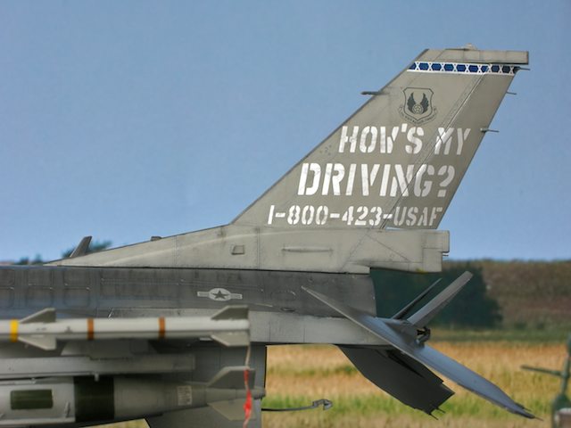 This jet only exist in the silver screen. It was featured in an Air Force recruiting commercial in the winter/spring of 2000/2001. The 1-800 How's My Driving markings were digitally inserted onto the vertical stab of this plane for the commercial.