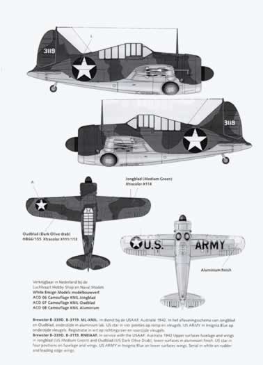 Brewster B-339D B-3119 of the USAAF in Australia in 1942. This machine was taken over by the USAAF following its evacuation from Java after the Japanese invasion. In standard finish with US blue and white star national insignia on the upper port and lower starboard surfaces of the wings and on either side of the fuselage, white serial number on the rudder and black U.S. Army on the lower surfaces of he wings. The forward portion of the spinner is in medium green.