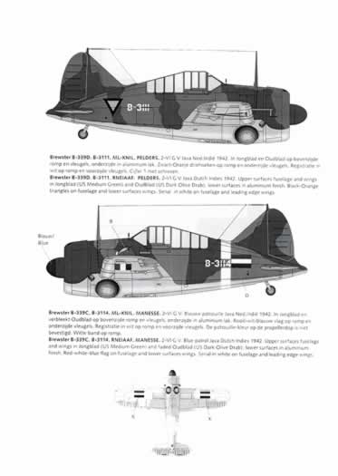 Brewster B-339C B-3114 “Manesse” of 2-VI G V Blue Patrol REIAAF in Java 1942. In standard finish with “flag” national insignia, white serials on either side of the fuselage and leading edges of the wings. The machine wears a “Java badge” and the name “Manesse” in white on the port side of the fuselage. The Leading portion of the spinner is in blue.