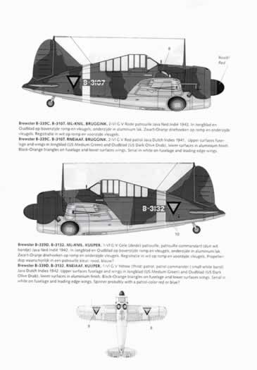 Brewster B-339C B-3107 of 2-VI G V (2nd Squadron) RNEIAAF Red Patrol, Java, Dutch East Indies in 1941. In standard finish with Black and orange national insignia, white serials on either side of the fuselage and leading edges of the wings and a white band around the rear fuselage. The machine wears a “Java badge” comprising a brown rhinoceros head on a yellow circle background and the name “Bruggink” in white.