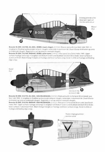 Brewster B-339C B-3110 “Van Helsdingen” of 2-VI G V Red Patrol REIAAF in Java 1941. In standard finish with black and orange national insignia, white band around the rear fuselage and white serials on either side of the fuselage and leading edges of the wings. The machine wears a “Java badge” and the name “Van Helsdingen” in white on the port side of the fuselage. The Leading portion of the spinner is in red.
