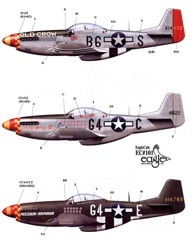 - “Old Crow” P-51D-10-NA 44-14450 B6 S flown by Colonel C.E. “Bud” Anderson. The accompanying notes list the machine as being in overall natural metal finish and it wears the group’s red and yellow striped spinner and chequerboard markings as well as a red rudder indicating that it was an aircraft belonging to 363rd Fighter Squadron.