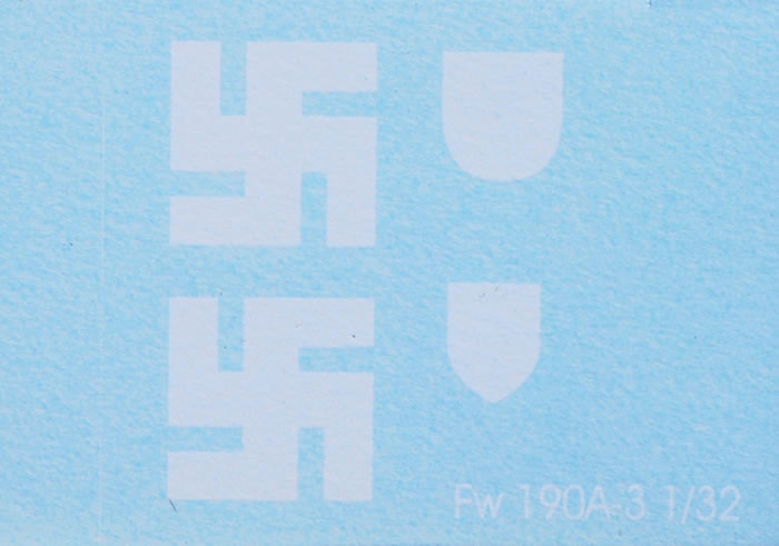 Markings for two aircraft are supplied in the form of two self-adhesive masking sheets and four small decal sheets. The masking sheets cover national markings, numbers and other large markings. The decal sheets contain Werknummern, hakenkreuz, plus emblems. White backing decals are included for these markings too. Decals are in good register and are well printed.