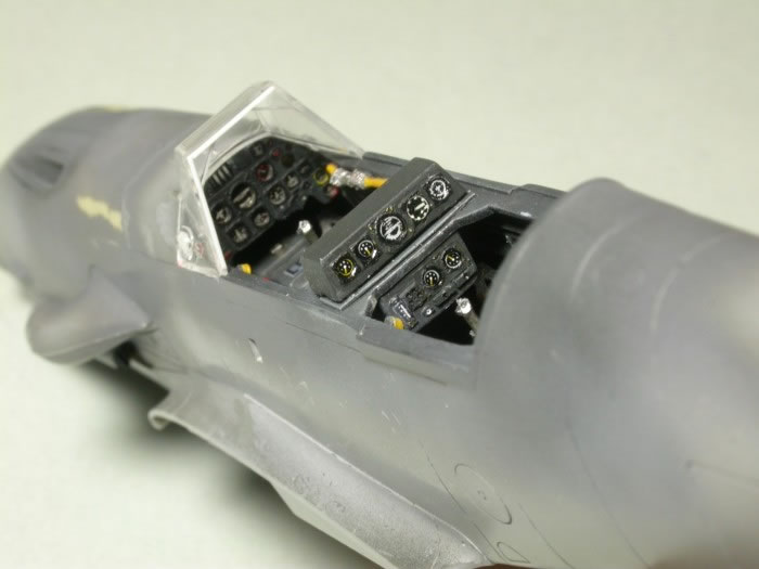 For the instructor's instrument panels I used the Falcon part (upper panel) and a scratch built part (lower panel). Both panels were completed with single PE gauges that I cut from the second Aires PE instrument panel. The instrument dials were punched out from various decal sheets.
