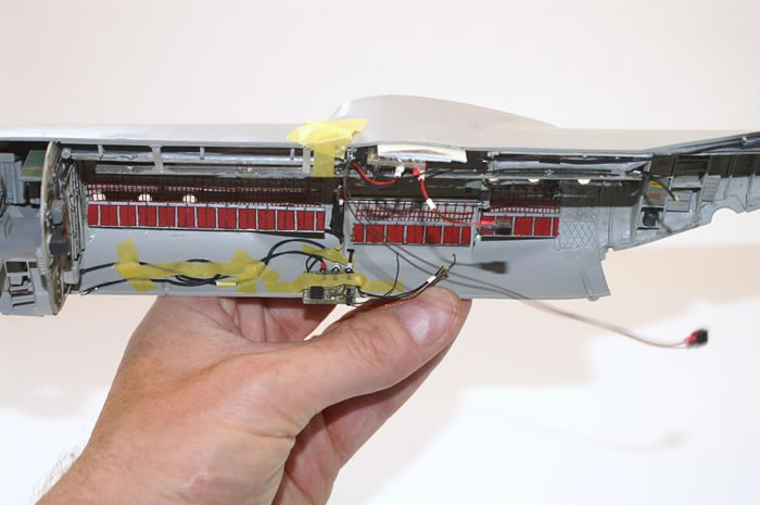 Wiring, fibre optic rods and LEDs for position lights (wings and tail), landing lights (wings and wheel wells) and rotating beacons (top and bottom of fuselage).